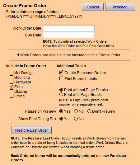 After using the Restore Last Order feature, you have the option to view alist of the Work Orders that have been reset. To make a Frame Order, click the Create a Frame Order button again and then click the Proceed button.