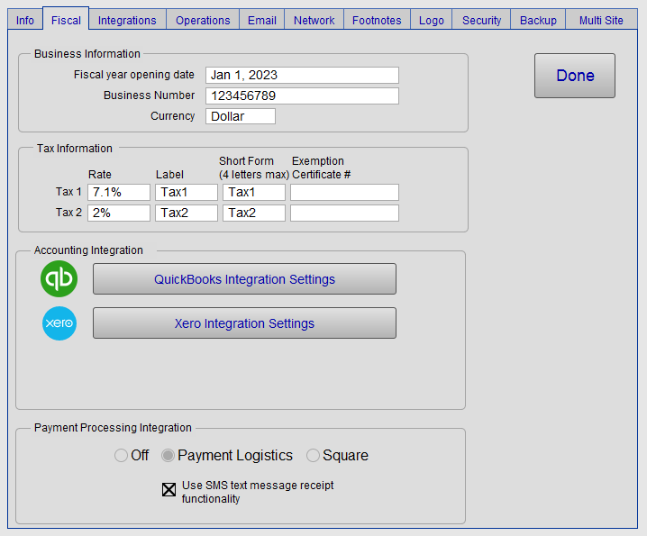 For a single tax, enter the rate, label, short form and exemption number into the Tax 1 field. Leave Tax 2 blank.