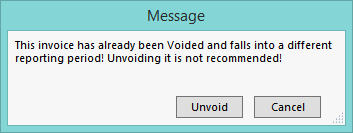 If the Invoice has already been Voided, and if the Invoice falls into a different reporting period, then FrameReady will alert you that un-voiding is not recommended.