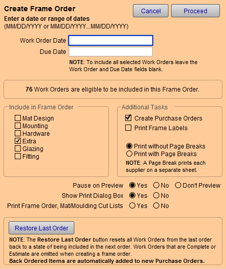 Leave the Date fields blank to select all Work Orders since the last time you placed a Frame Order.