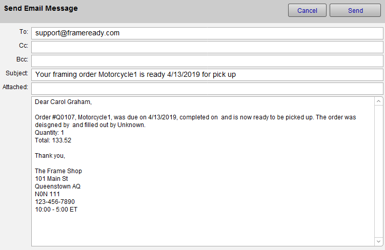 Depending on how you have set up your email information, the Email button composes an email message with the subject: Your Framing Order is Ready.