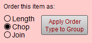 The three radio buttons; Length, Chop and Join allow you to order your product as length moulding, chopped moulding, joined or closed corner frame regardless of how you may wish to price your frame (except when using the Default pricing formula).