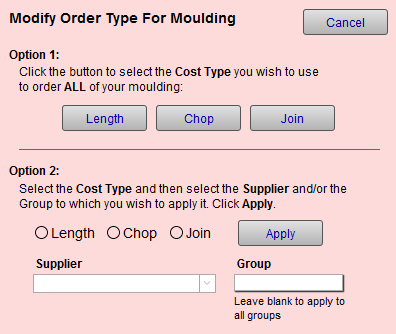 Option 1: Select the Cost Type you wish to use when ordering all your moulding.