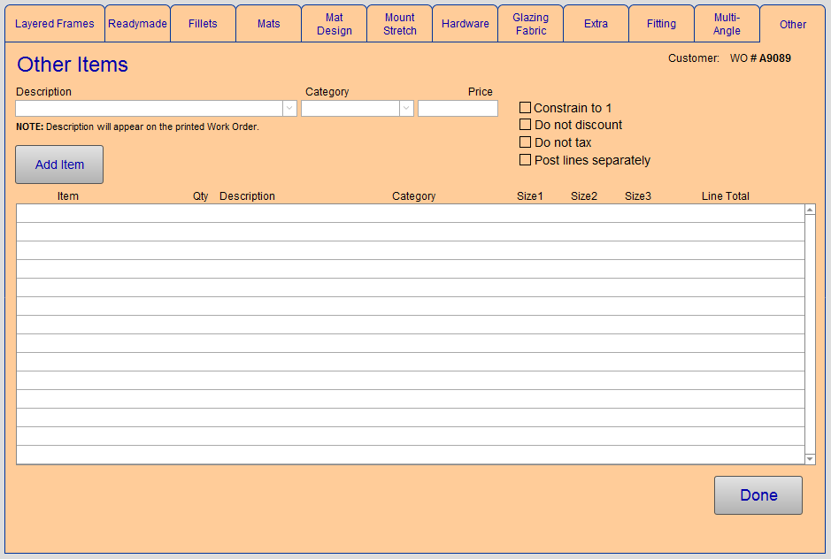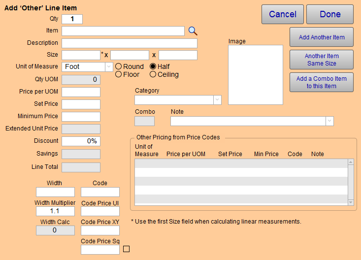 The Other field allows for calculating odd items and adding them to a Work Order.