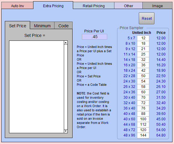 Extras can be priced by a single charge or Set Price for items that are not affected by the size of the frame.