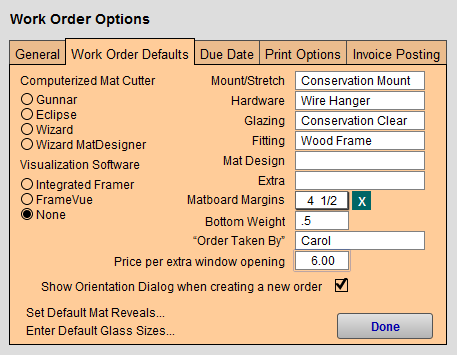 The Work Order Options window appears; open the Work Order Defaults tab.