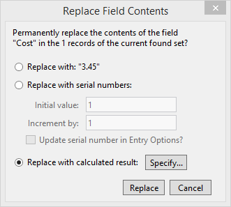 The Replace Field Contents dialog box appears. It is important to pay close attention to the message which appears.