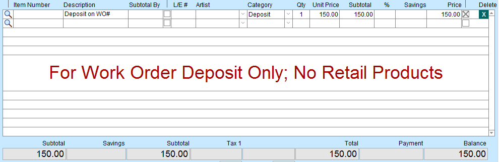 Tip: You will not have a document to hand to the customer which shows the total retail price with tax minus the deposit they gave you. From the Work Order, however, you can print a Proposal, which includes the total amount with tax.