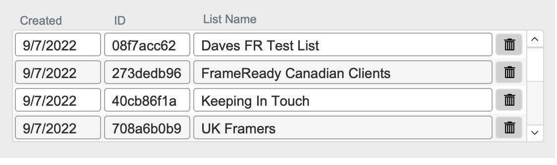 Use the trash can icon (right of each record) to delete the List from FrameReady; doing so will prevent FrameReady users from assigning Contacts to that particular List.