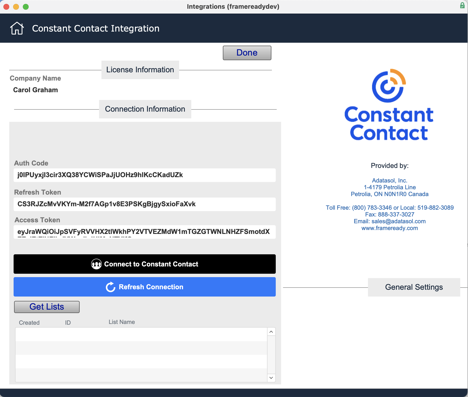 Now that you have all of these fields filled in with your information you can move to the next part of setting up the integration which is bringing in your Constant Contact lists into FrameReady so you can assign contacts to them.