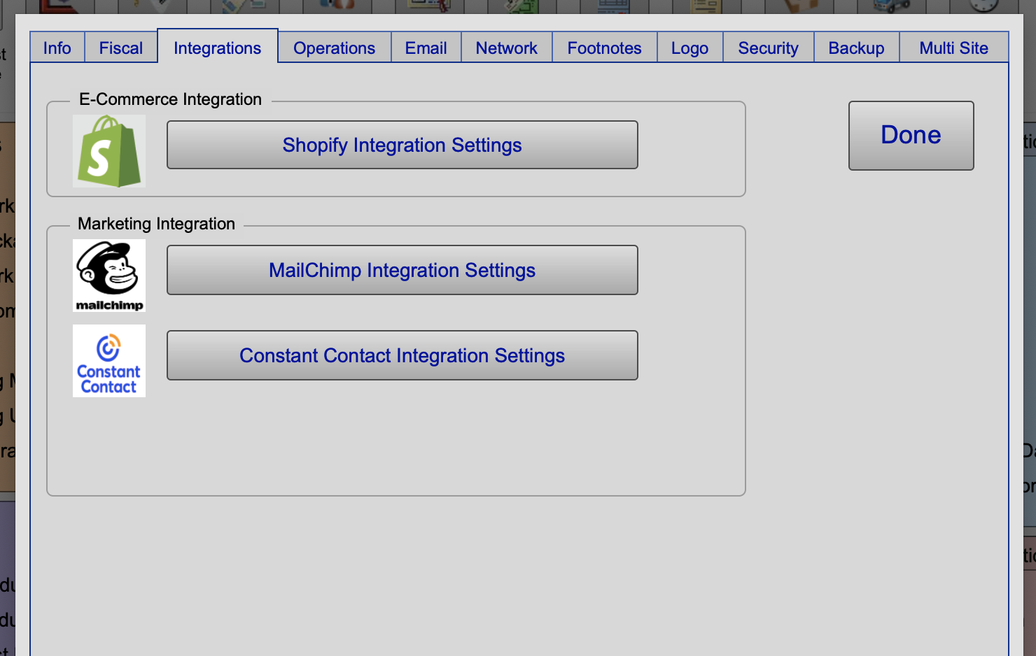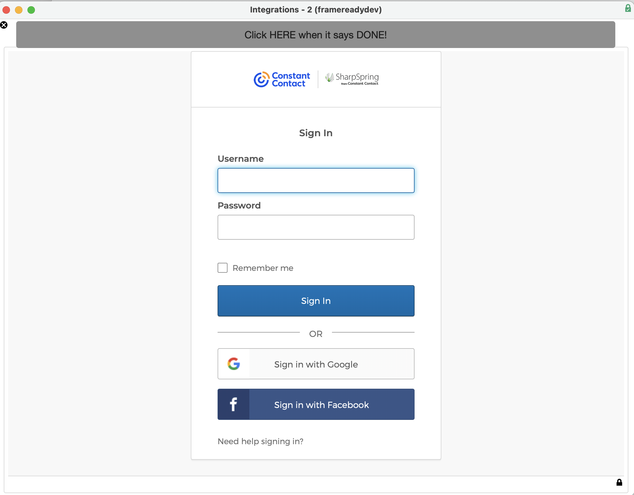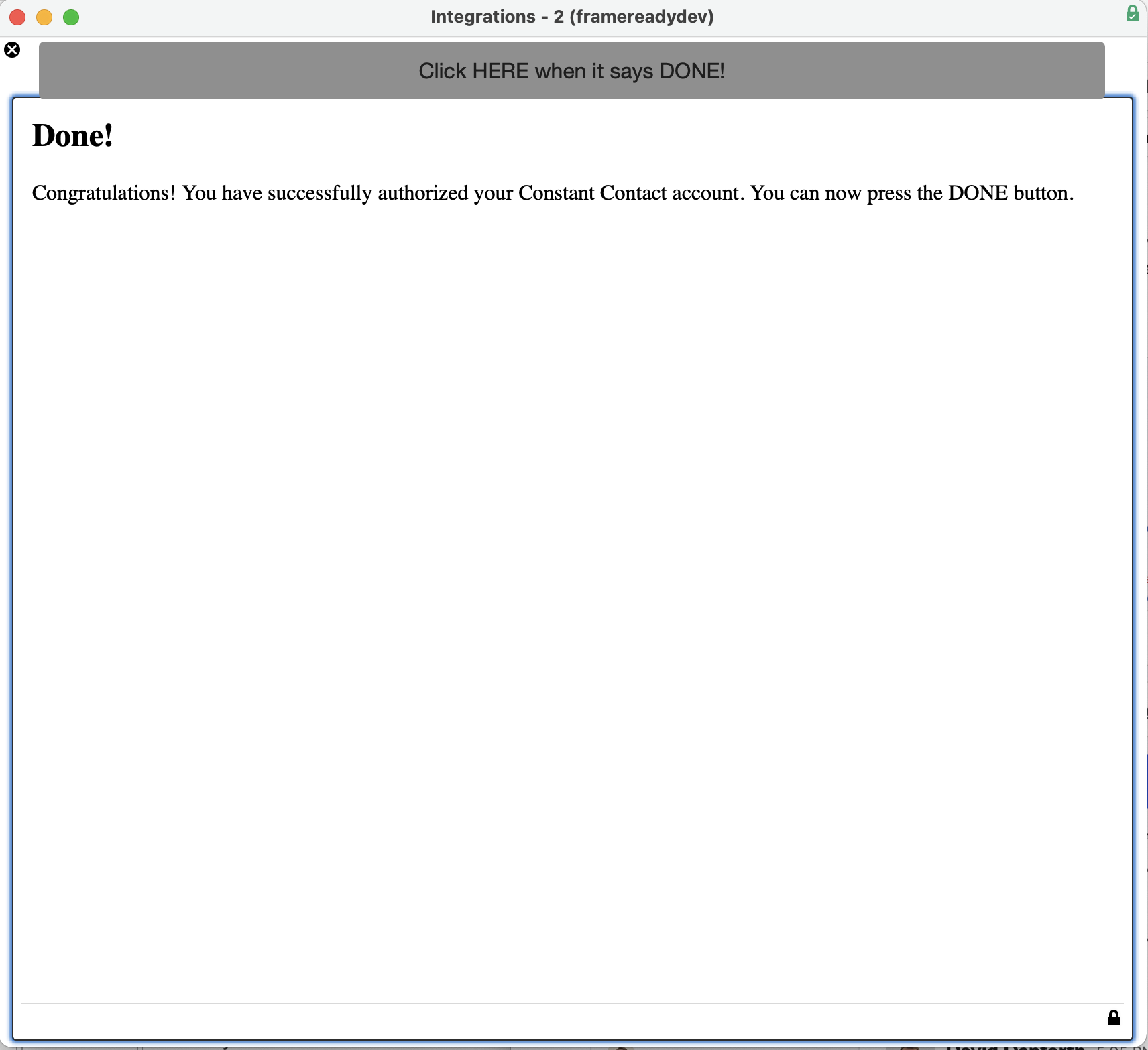 Click the Click HERE when it says DONE! button to finish the authorization process and return to the Constant Contact Integrations window in FrameReady.