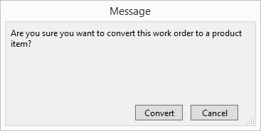 A dialog box appears asking if you are sure you want to change this Work Order to a Product.