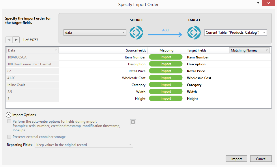 Confirm that the "Mapping" fields match and are green. Click the Import button (bottom right).