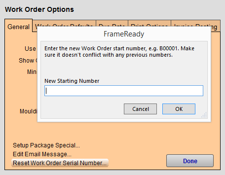 Tip: The standard Work Order number format is a letter followed by four numbers, e.g. A0245. If you pad your New Starting Number with zeros, e.g. B0001, then FrameReady auto-increments to B0002, B0003 etc.