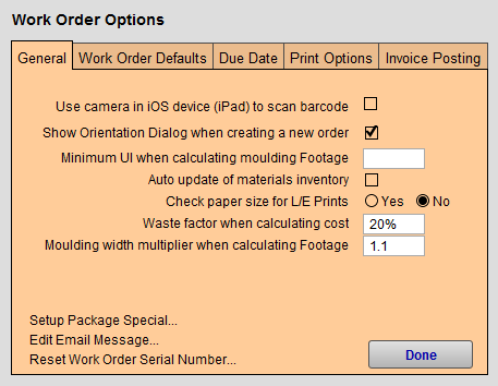On the Main Menu, open the Options tab in the Work Order section.