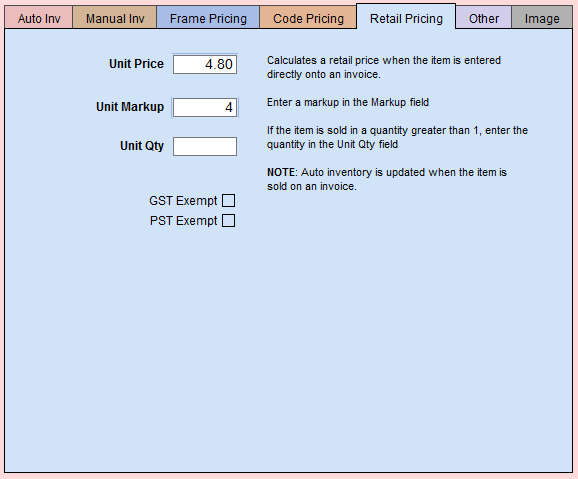 The Retail Pricing tab (blue tab in Price Codes file, all groups) is used to calculate a retail price when the item is sold directly on an Invoice.