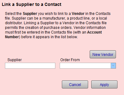 In other words, all your suppliers must have a record created in the Contacts file. Linking a Supplier to a Vendor permits the creation of Purchase Orders.