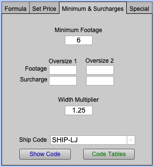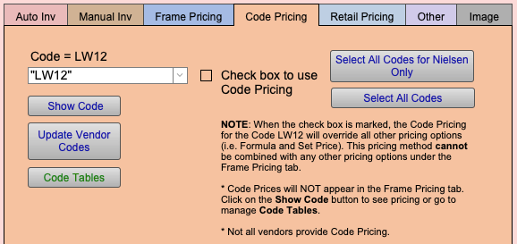 When a Code is used to price a moulding in this tab, prices will not be visible in the Frame Pricing tab. This is because the Code Pricing is the Retail Price and takes precedence over all other methods of pricing. However, the Ship Code can be used in conjunction with the Vendor Matrix Code. Eg. LW12