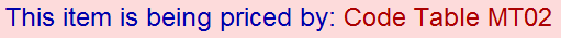 When an item is priced by a Code Table, the name of table is displayed at the top of the screen, e.g., This item is being priced by: Code Table [Name].