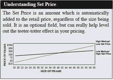 The Set Price is an amount automatically added to the final Retail Price -- regardless of the size or length sold. Using it can really help level out the "teeter-totter" effect in your pricing.