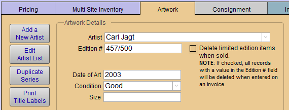 Sometimes customers wish to reserve certain Limited Edition numbers. To record these for each artist they collect, simply type in the number in this field.