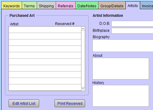 If you sell a piece of artwork (Artists Tab) that has the artist listed, then the information auto-fills here.