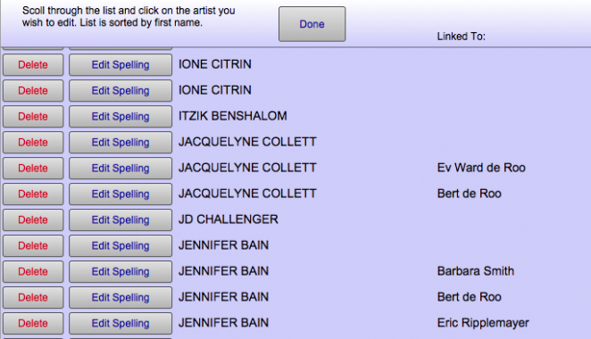 A list of artists appears. Each record has its own Delete and Edit Spelling button.