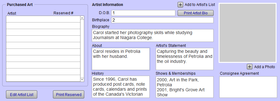 Tip: If you wish to record your customer's favorite artists, works they may have purchased from you, or have had framed, then the Purchased Artwork section is where you do it.