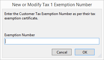 The New or Modify Tax 1 Exemption Number dialog appears.