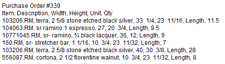 The PO items are listed in Comma Separated Values (CSV) format: