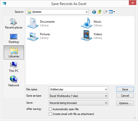 The Save Records as Excel dialog appears.