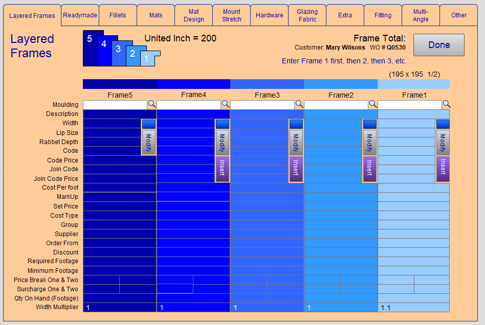 Use this menu to to price up to five frame layers. Entering in the frames in a layered frame order begins with the innermost frame or filet. Frame1 will be the closest to the artwork.