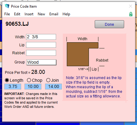Used when adding in a new moulding that is not currently in your Price Codes file.