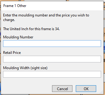 Click the blue Override button to access a screen where you can enter a Moulding Number and Retail Price for the entire frame. Use this when the sample has not yet been entered into the Price Codes file.