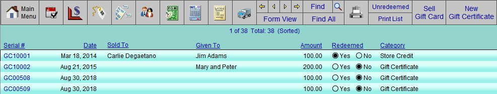 Sort each column by clicking on each underlined word, i.e. Serial#, Sold To, Given To, Amount, Redeemed, Category.