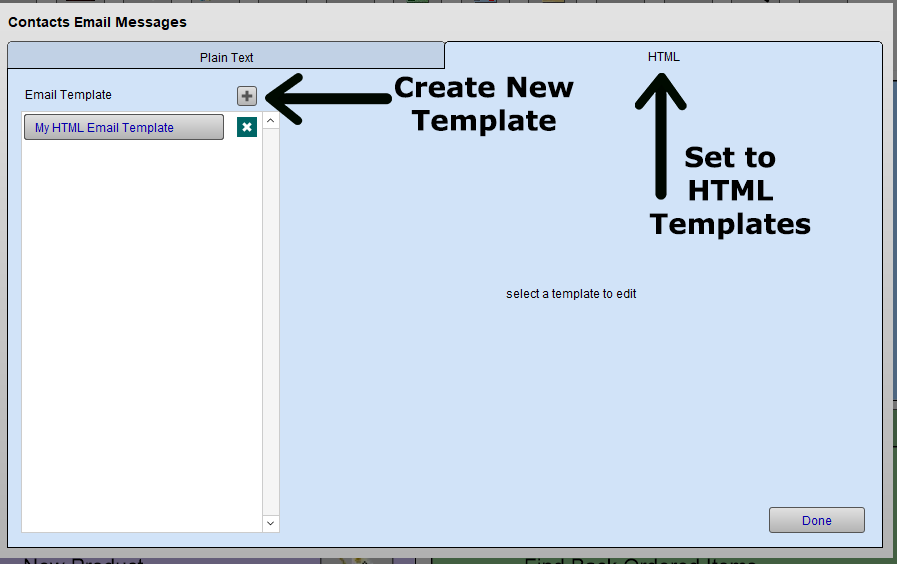 The Contacts Email Messages window appears. Open the HTML Template tab.