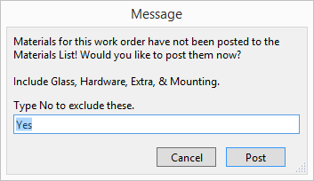If the materials for that Work Order have not yet been posted, then a dialog box appears. To include Glass, Hardware, Extra and Mounting items, make sure Yes is in the field and then click Post.