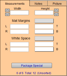 The Matboard Margins in this field indicate the total amount of margins to appear between the image and the frame. Use the Mat Margins pop-up menu to quickly enter all four matboard margins at once. Select the appropriate number from the menu of pre-entered amounts or use the Edit... feature to customize the list or use Other... to create a one-time entry.