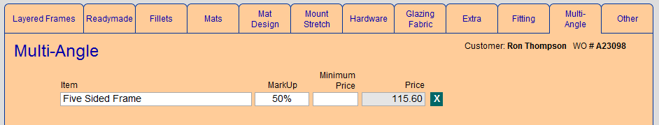 The Multi-angle component calculates a charge to cover the additional time needed to create a multi-angled frame. The charge is based on a percentage of the total framing price; the more complicated the construction, the higher the percentage.