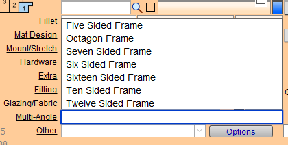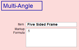 The Multi-angle component calculates a charge for the additional time it takes to create a multi-angled frame. The charge is based on a percentage of the total framing price; the more complicated the construction, the higher the percentage.
