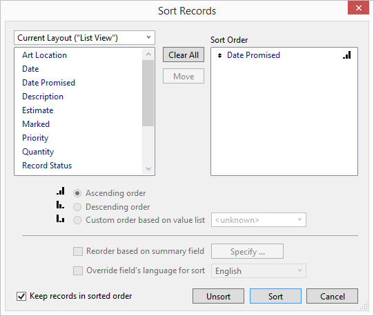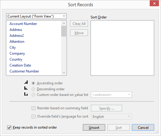 Radio buttons for Ascending and Descending allow you to sort individual fields by different orders.
