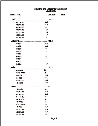 This document shows totals by group and quantity of specific items used for any time period.