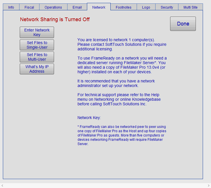 A network key will be provided to you by Softtouch Solutions when you are using FrameReady on more than one computer.