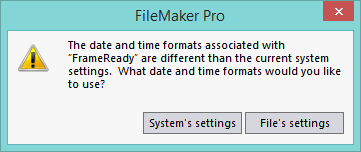 The date and time formats associated with FrameReady are different than the current system settings. What date and time formats would you like to use?
