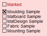 When new samples arrive, locate them in your Price Codes and mark the Matboard Sample or Moulding Sample checkbox field (top right).