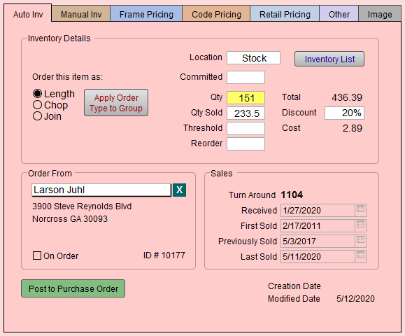 The Auto Inv tab is used to identify inventory levels (used when FrameReady is set to automatically update your inventory either on a Work Order or on an Invoice.)