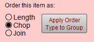 Shows three radio buttons; Length, Chop or Join. This option allows you to order your product as length moulding, chopped moulding, joined or closed corner frame regardless of how you may wish to price your frame.
