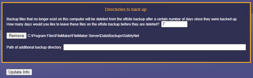 After changing the number of days to leave files on the offsite backup before they are deleted, click the Update Info button.