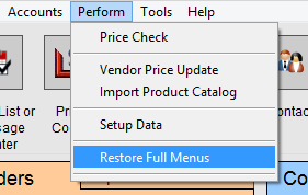 On the Main Menu, in the file menubar, click Perform and choose Restore Full Menus.