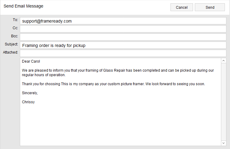 Depending on how you have set up your email information, the Email button composes an email message with the subject: Your Framing Order is Ready.